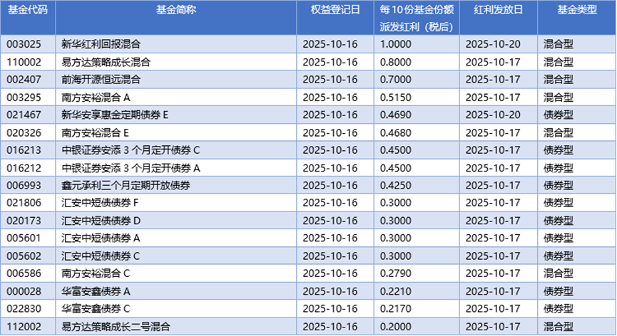 四、10月16日基金分红一览