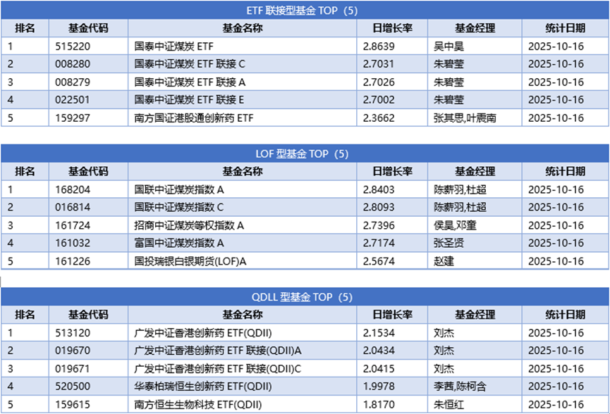 分投资类型看,同样剔除掉分级杠杆及固定收益两类基金的影响,股票型基金冠军为申万菱信医药先锋股票A,日增长率为2.8259%;债券型基金冠军为天治可转债增强债券C,日增长率为0.5313%;混合型基金冠军为永赢先锋半导体智选混合A,日增长率为5.8708%;货币型基金冠军为红土创新货币B,日增长率为0.0185%;ETF联接基金冠军为国泰中证煤炭ETF,日增长率为2.8639%;LOF型基金冠军为国联中证煤炭指数A,日增长率为2.8403%;QDII基金冠军为广发中证香港创新药ETF(QDII),日增长率为2.1534%;下面是不同类型基金日增长率TOP5 (剔除掉分级基金的影响)