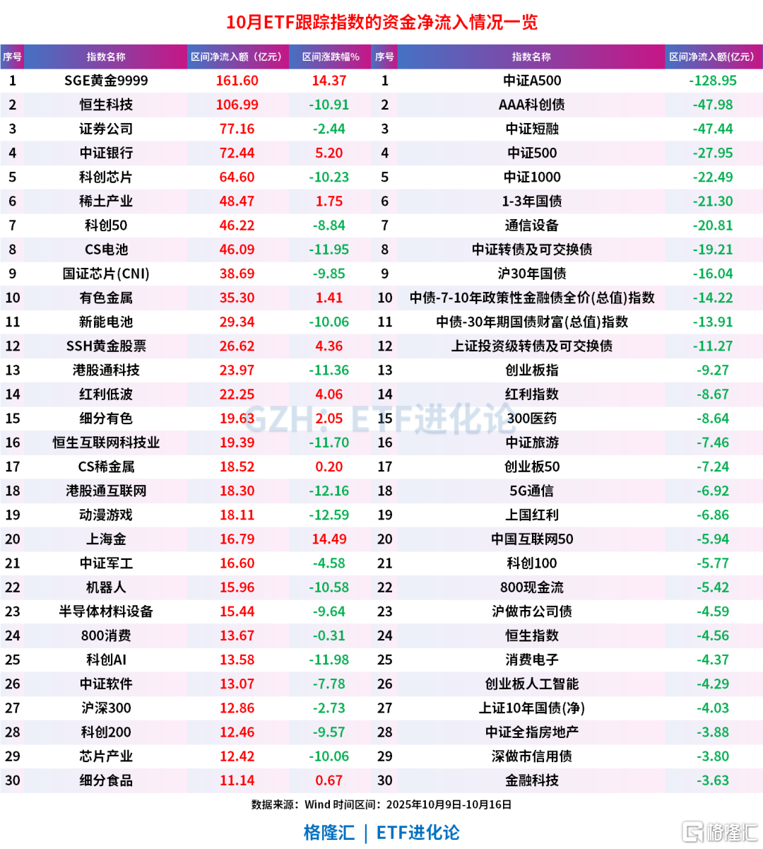 从指数角度来看,SGE黄金9999、恒生科技、证券公司、中证银行、科创芯片、稀土产业、科创50在10月分别净流入161.60亿元、106.99亿元、77.16亿元、72.44亿元、64.60亿元、48.47亿元、46.22亿元。
