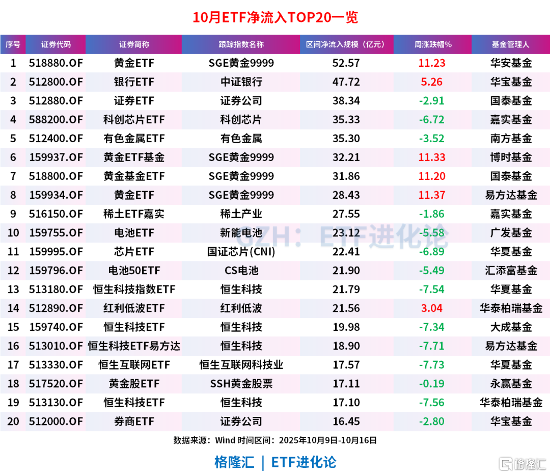 从具体ETF产品来看,黄金ETF、银行ETF、证券ETF、科创芯片ETF、有色金属ETF在10月分别净流入52.57亿元、47.72亿元、38.34亿元、35.33亿元、35.30亿元。