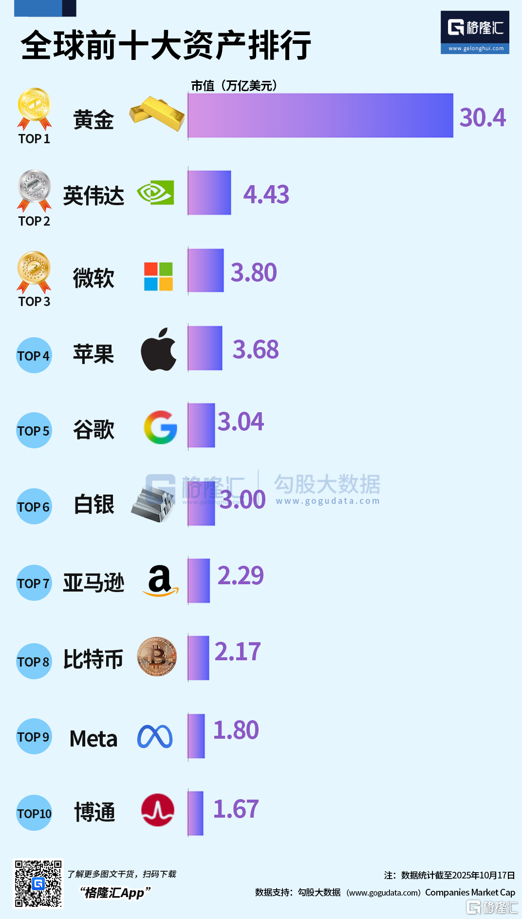 将排行榜“2-10”名的资产市值:英伟达 微软 苹果 谷歌 白银 亚马逊 比特币 Meta 博通加总:25.86万亿美元,黄金凭借30.4万亿美元市值独领风骚,难以望其项背在此时写实了。