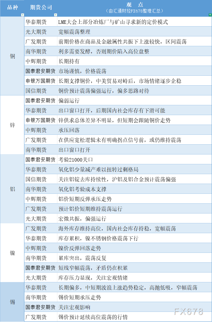 期货公司观点汇总一张图:10月20日有色系(铜、锌、铝、镍、锡等)。更多详见本文的汇通财经特制图。