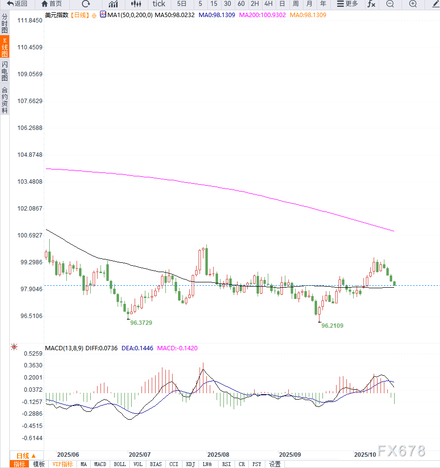当前美元走势受到多重宏观因素的拖累。在财政僵局与降息预期叠加的环境下,美元短线维持弱势,技术面显示98关口或成为关键支撑。若美联储会议纪要延续鸽派倾向, 美元指数或继续下探97.80一线;