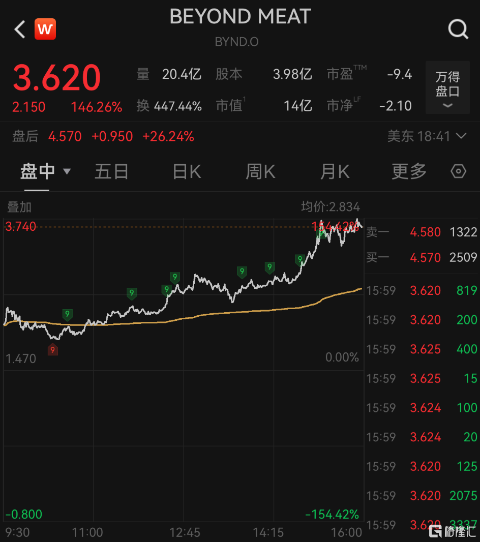 消息面上,人造肉第一股Beyond Meat昨夜再度大涨,收盘涨146.26%,近三个交易日股价累计涨幅近600%。