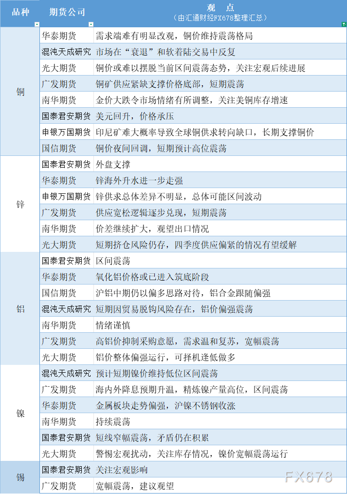 期货公司观点汇总一张图:10月22日有色系(铜、锌、铝、镍、锡等)。更多详见本文的汇通财经特制图。