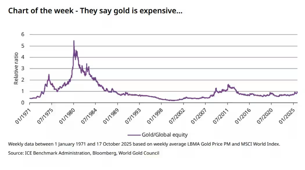 世界黄金协会(WGC)美洲区首席执行官兼全球研究主管Juan Carlos Artigas在X平台发文称,虽然有人认为黄金价格偏高,但“与全球股市相比,并不算贵”。他补充说:“价格从来不是孤立存在的,价值总是与更广泛的市场环境相对的。”