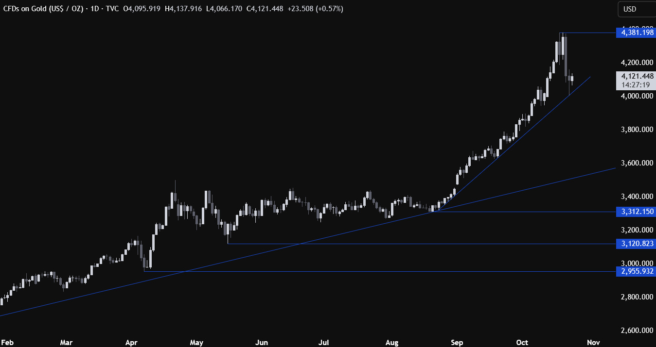 在日线图上,黄金终于出现回调,并在4000美元一线获得支撑,同时该区域还有趋势线支撑。买方可能会继续在趋势线附近进场,但若金价跌破该支撑位,空头可能加大仓位,进一步将价格压低至3600美元区域。