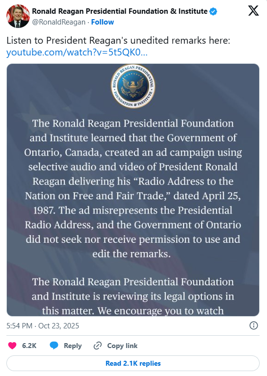 广告风波:里根演讲片段成焦点 引发政治与法律双重争议安省的广告原意是为争取美国民众与政界支持加拿大立场。广告引用了美国前总统罗纳德·里根(Ronald Reagan)1987年4月25日的广播讲话,里根在演讲中批评高关税政策,警告其将引发“报复与贸易战”,并导致价格“人为高企”,最终伤及美国消费者和工人。