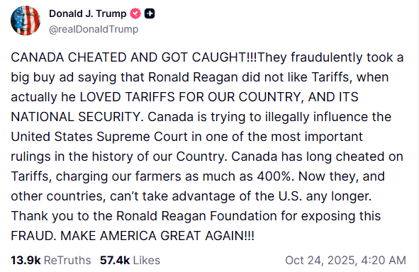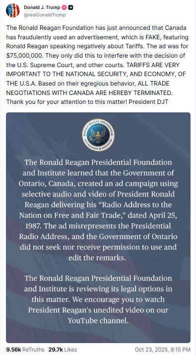 “关税对美国的国家安全与经济至关重要。基于安大略省的恶劣行为,美国与加拿大的所有贸易谈判即刻终止。”