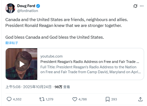 他同时附上由里根图书馆发布的未剪辑版演讲视频链接,并宣布广告将在周末继续播放、周一起暂停,以示善意。福特透露,暂停决定是在与总理马克·卡尼(Mark Carney)会谈后作出。