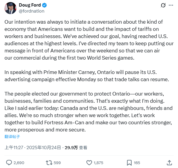 FX168财经报社(北美)讯 加拿大与美国的贸易关系在本周再度陷入紧张。因安大略省政府推出的一则“反关税”广告,美国总统唐纳德·特朗普(Donald Trump)于周四深夜宣布全面终止与加拿大的贸易谈判。对此,安省省长道格·福特(Doug Ford)周五(10月24日)迅速回应,表示广告将在本周末继续播放,随后自下周一起暂停播出,以为恢复谈判创造空间。