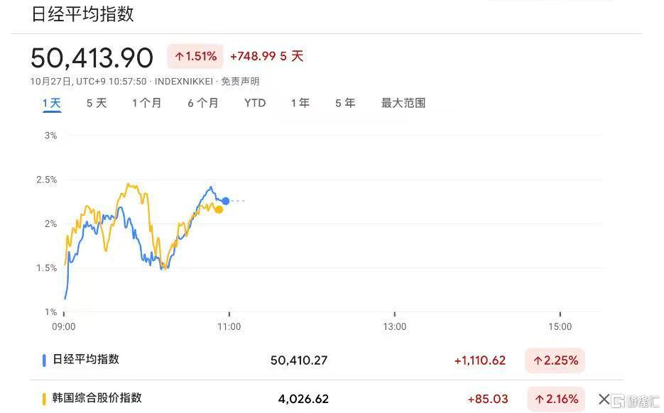 周一(10月27日),日韩股市集体高开,续创下新高。