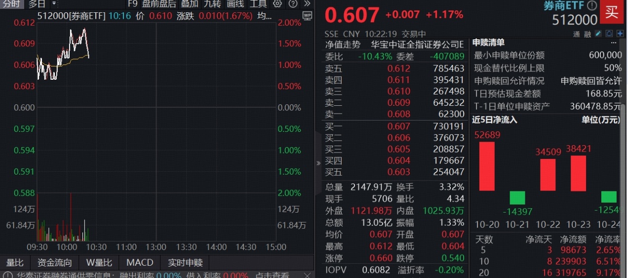 388亿规模券商ETF(512000)高开高走,场内价格一度涨近2%,现涨1.17%,不足半日实时成交额超13亿元,交投情绪高涨。