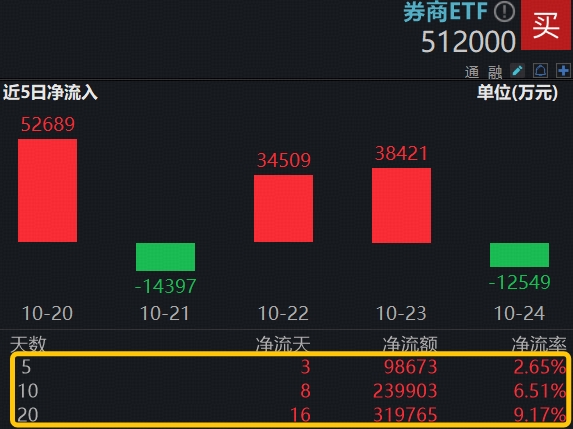 消息面上,上周五(10月24日),中信证券、东方财富两家龙头券商发布三季报。中信证券公告显示,营业收入和归母净利润分别为558.15、231.59亿元,同比分别增长32.7%、37.9%,其中第三季度实现营业收入和归母净利润227.75、94.40亿元,单季度归母净利润创下新高!