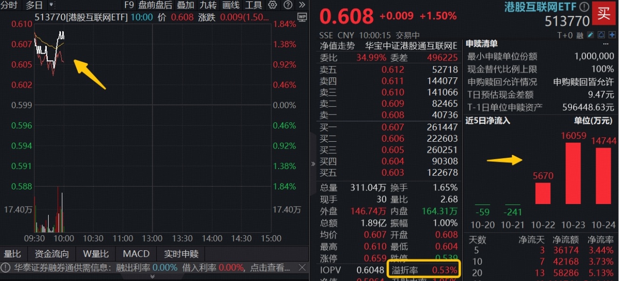 港股AI核心工具——港股互联网ETF(513770)早盘高开,场内价格现涨1.5%,盘中宽幅溢价,实时溢价率超0.5%,显示买盘资金强势介入。上交所数据显示,港股互联网ETF(513770)近3日连续获资金净流入合计3.65亿元。