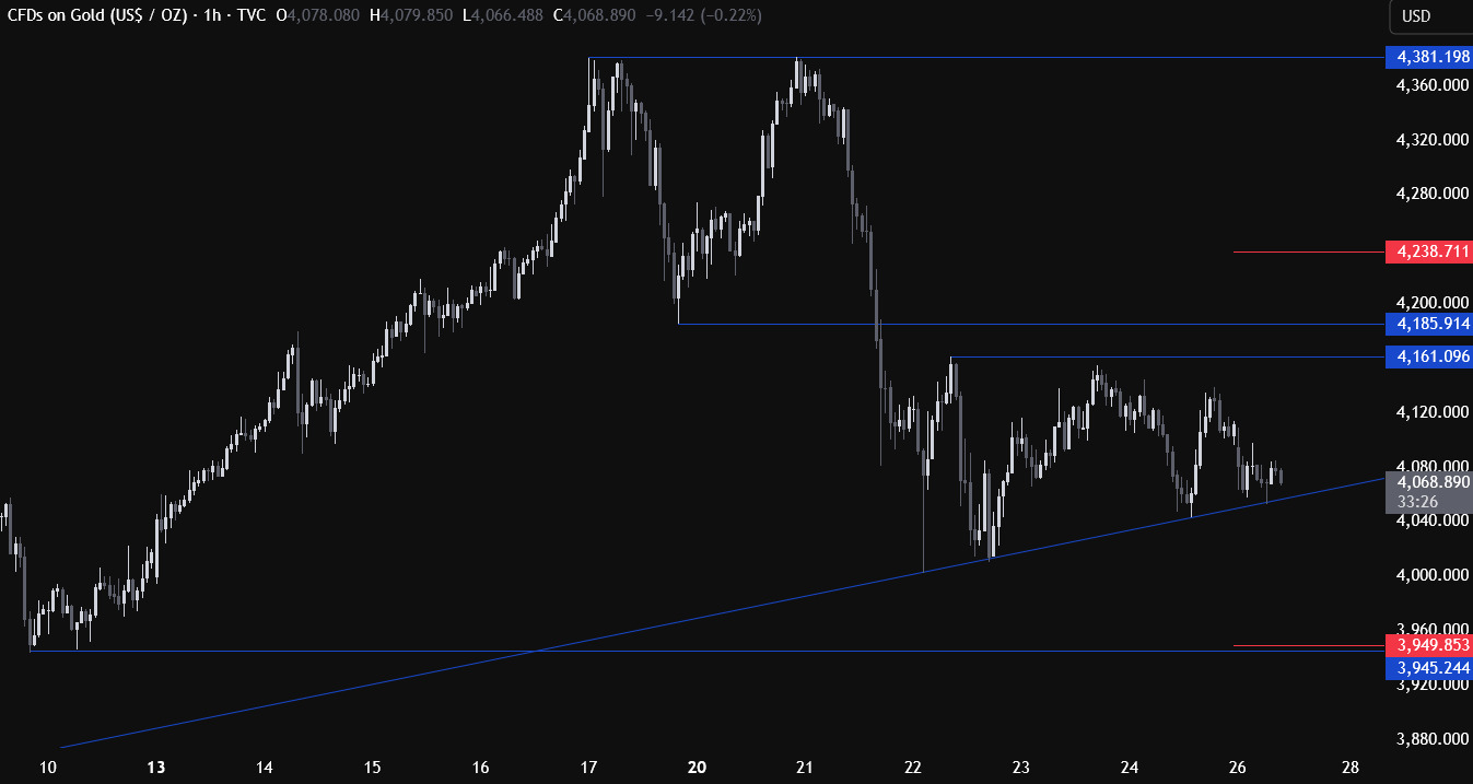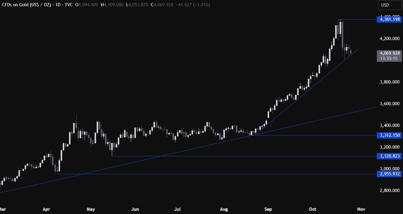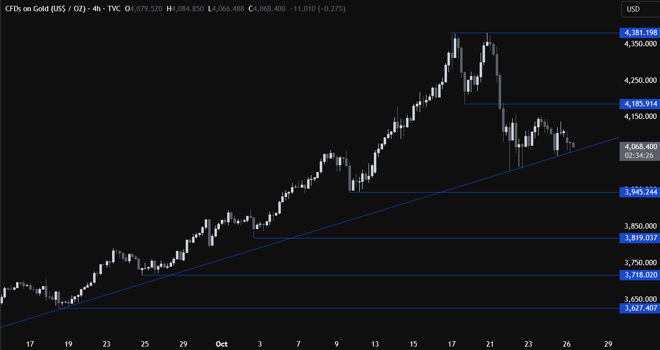 截至发稿,现货黄金下跌1.3%,至4059.22美元,日内最低触及4023美元。金价曾在10月20日触及创纪录的4381.21美元高位,当时受到美国降息预期上升以及地缘政治与经济不确定性支撑,但随后已下跌逾5%。