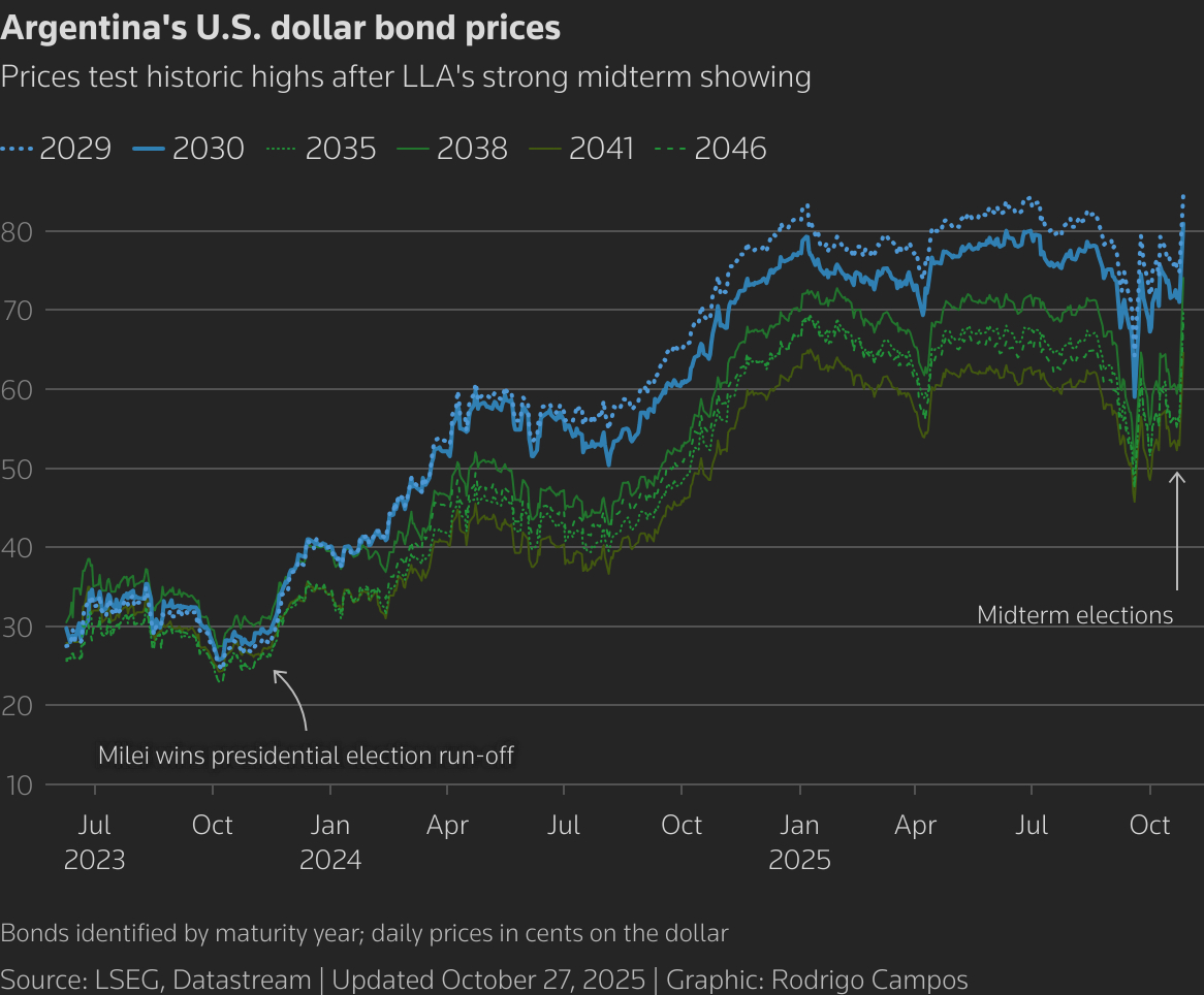 FX168财经报社(北美)讯 阿根廷金融市场周一(10月27日)强势反弹,总统哈维尔·米莱(Javier Milei)领导的“自由前进党”(La Libertad Avanza)在周日中期选举中赢得压倒性胜利,为持续推进市场化改革和巩固美国金融支持奠定坚实基础。