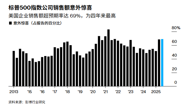 分析方面,根据FactSet的数据,截至目前,标准普尔500指数第三季度的年度盈利增速为9.2%。如果这种趋势持续,将是连续第九个季度实现盈利增长。美国企业似乎在关税压力下几乎毫发无损,通过涨价和削减成本来维持利润率。标准普尔500指数成份公司中,销售数据超出预期的比例达到了四年来的最高水平。