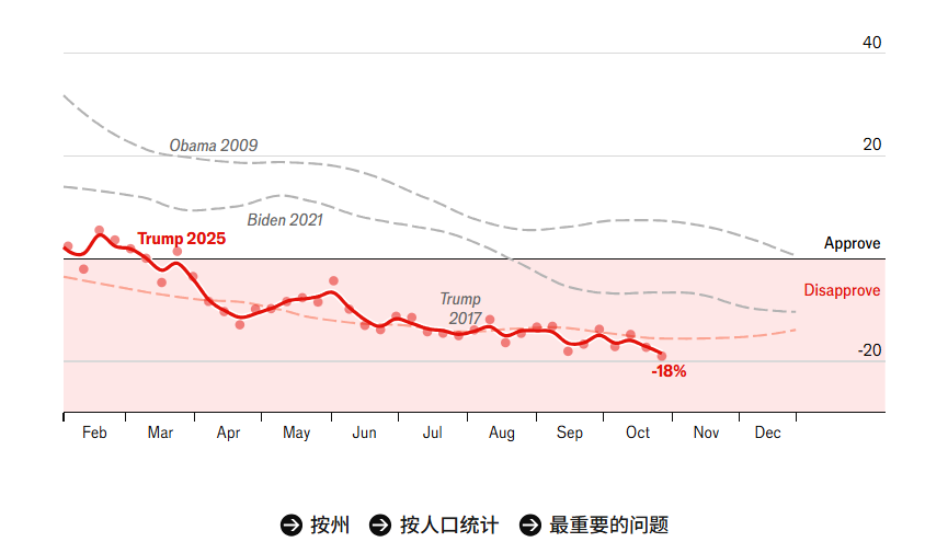 两次他的净支持率都很快转为负值。如今为负18%,是他就职以来的最低水平,比他第一任期内的任何时候都低3个百分点。