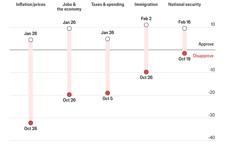 YouGov的数据也显示,美国人如今对他在移民问题上的处理方式表示不满,而移民原本是他连任竞选的核心议题之一。