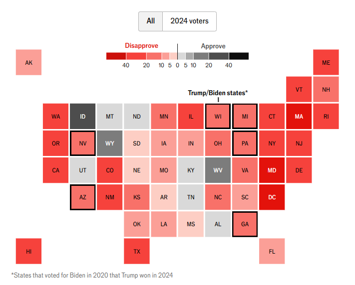 特朗普的选民仍然高度认可他作为总统的表现。但预测同时显示,即使是在几个月前刚刚投票支持他的州,失望情绪也广泛存在。