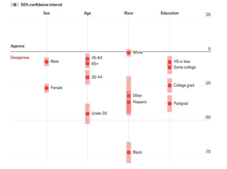 和以往的共和党政客一样,白人和男性选民最有可能支持特朗普的执政表现,而年轻选民和少数族裔群体的反对最为强烈。受教育程度越高的人——包括大学毕业生和拥有研究生学历者,越不支持特朗普。