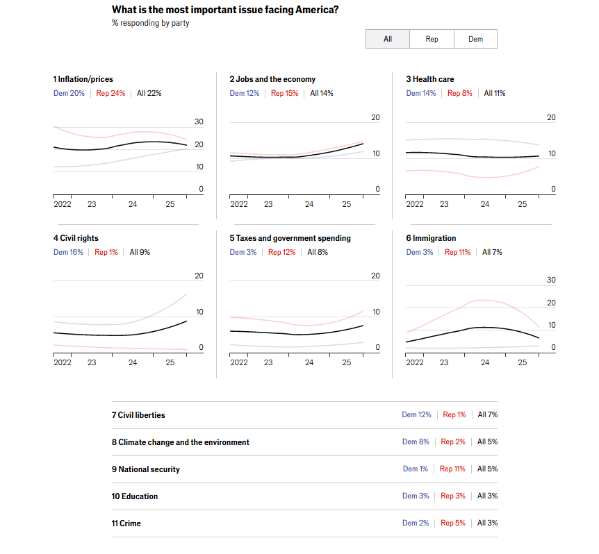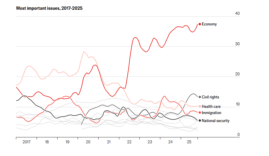 图表基于YouGov的每周调查数据显示,自2017年以来,美国成年人最关注的问题的变化趋势。