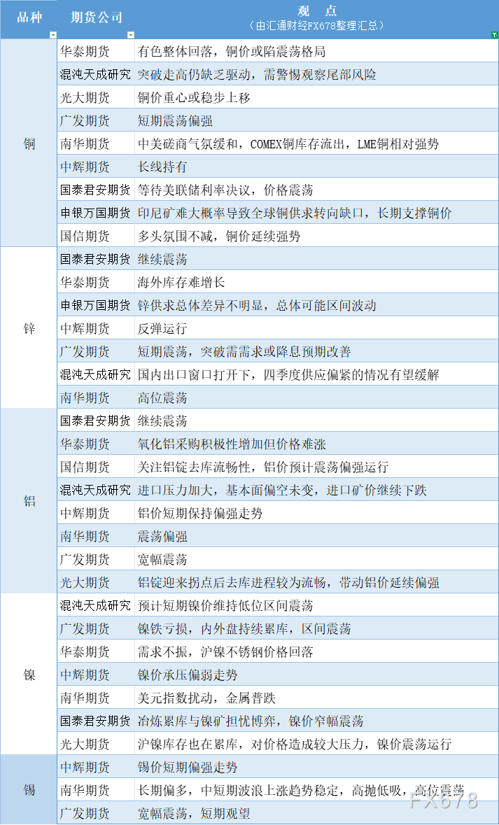 期货公司观点汇总一张图:10月29日有色系(铜、锌、铝、镍、锡等)。更多详见本文的汇通财经特制图。