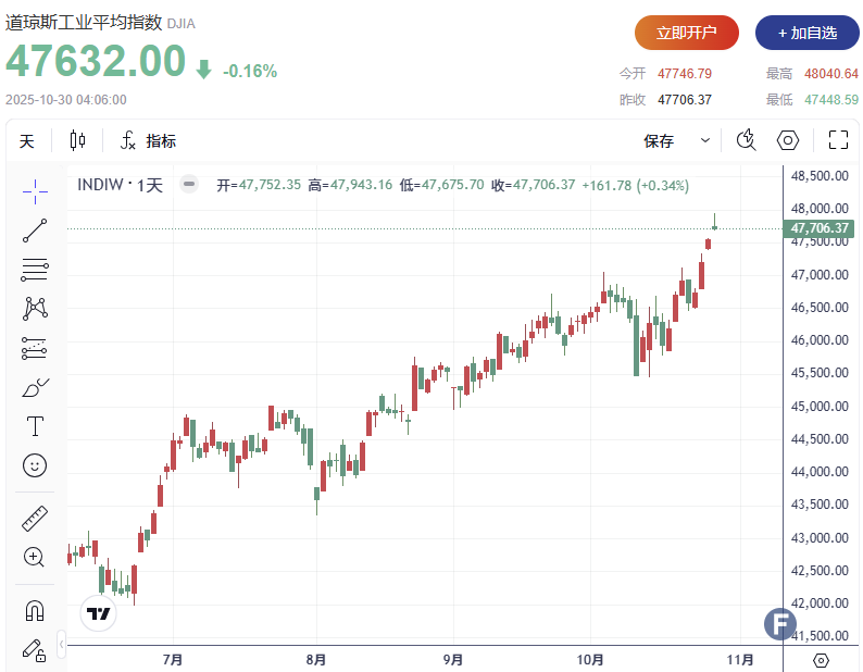 道指收跌 74.37点,跌幅 0.16%,报 47,632.00点;标准普尔500指数小幅下跌至 6,890.67点;而纳斯达克综合指数表现相对强劲,受英伟达(Nvidia)上涨推动,收涨 0.55%,创下新高 23,958.47点。盘中,道指一度上涨 334点,触及历史新高,但在美联储声明及鲍威尔讲话后迅速转跌。
