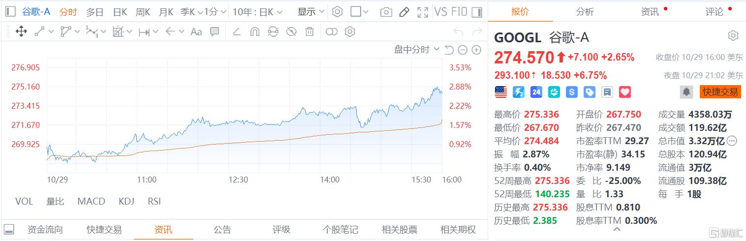 盈利能力方面,Q3谷歌净利润达到了349.79亿美元,大幅增长33%;每股摊薄收益为2.87美元,同比涨幅高达35%,远超市场预期的2.6美元。