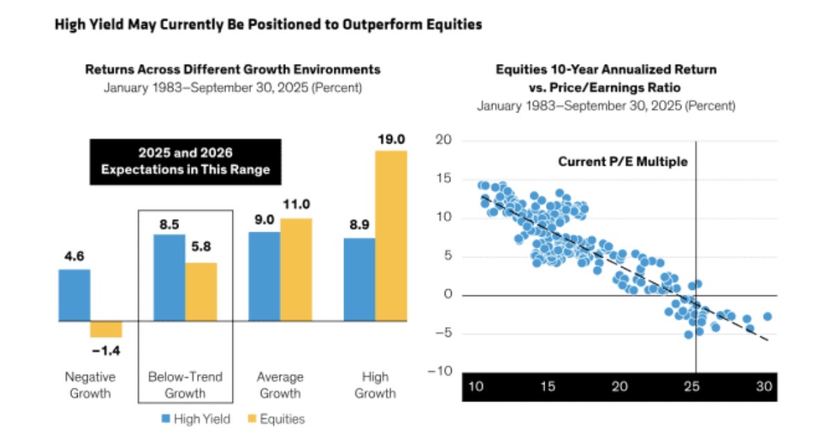 在经济增长乏力的时期,高收益债券实际上往往优于股票。