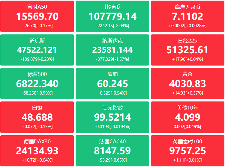 外汇:美元指数涨0.33%报99.549点,欧元兑美元跌0.25%,英镑兑美元跌0.30%,美元兑瑞郎涨0.21%,瑞典克朗兑美元跌0.22%,挪威克朗兑美元跌0.32%,丹麦克朗兑美元跌0.26%;离岸人民币兑美元报7.1107元,较周三跌133点;比特币跌3.04%逼近10.7万美元;以太币跌4.25%报3739美元。