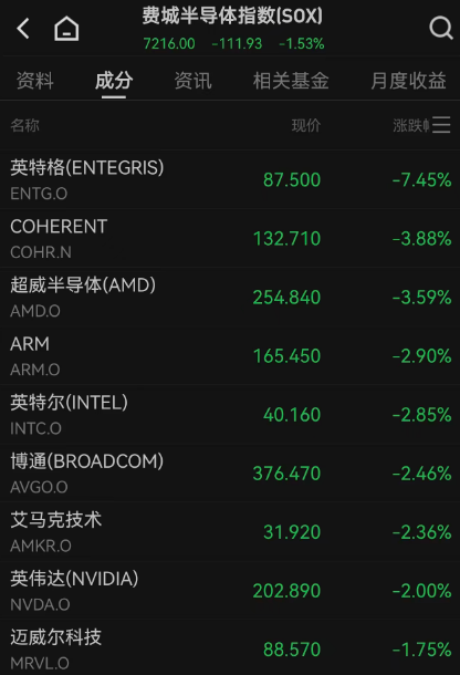 "这并不代表AI泡沫即将破裂,也不意味着股市将迎来重大逆转,但确实增加了短期回调的可能性。"Miller Tabak股票策略师Matt Maley指出。费城半导体指数当日跌1.53%,30只成分股中22家下跌,AMD跌3.59%,博通跌2.46%。