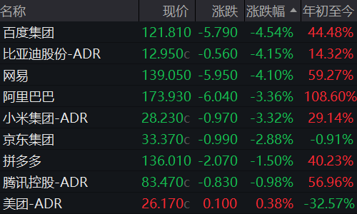中概股表现分化明显,纳斯达克中国金龙指数跌1.88%。热门中概股多数收跌,小马智行跌6.79%,百度跌4.54%,阿里巴巴跌3.36%,腾讯音乐跌3.23%,京东跌2.88%;好未来涨7.32%,新东方涨3.91%。