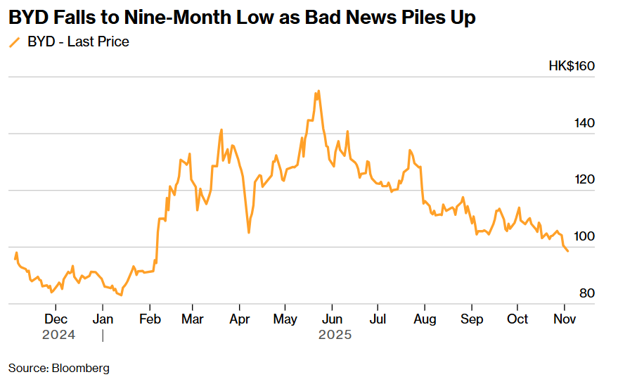 FX168财经报社(亚太)讯 周一(11月3日)比亚迪股份股价逼近九个月低点,此前这家汽车制造商连续第二个月销量下滑,再次跌至中国市场第二位,表明国内市场日益激烈的竞争可能正在影响需求。