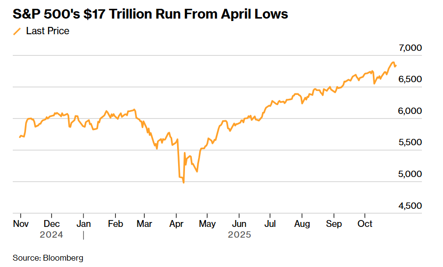随着11月交易开启,标普500指数期货小幅上扬,三大股指期货上涨0.3%至0.5%。此前该指数受人工智能带动的盈利乐观情绪推动再创纪录。根据彭博数据,自4月低点以来,标普500指数的市值增长约17万亿美元。