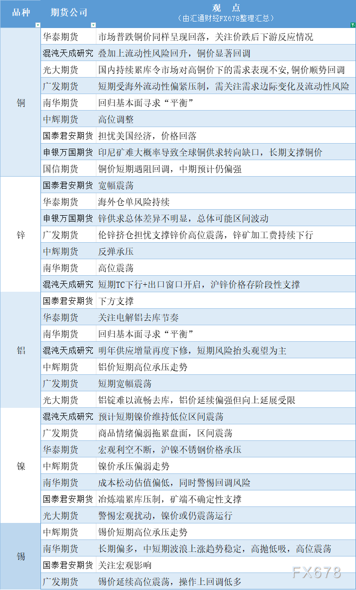 期货公司观点汇总一张图:11月5日有色系(铜、锌、铝、镍、锡等)。更多详见本文的汇通财经特制图。