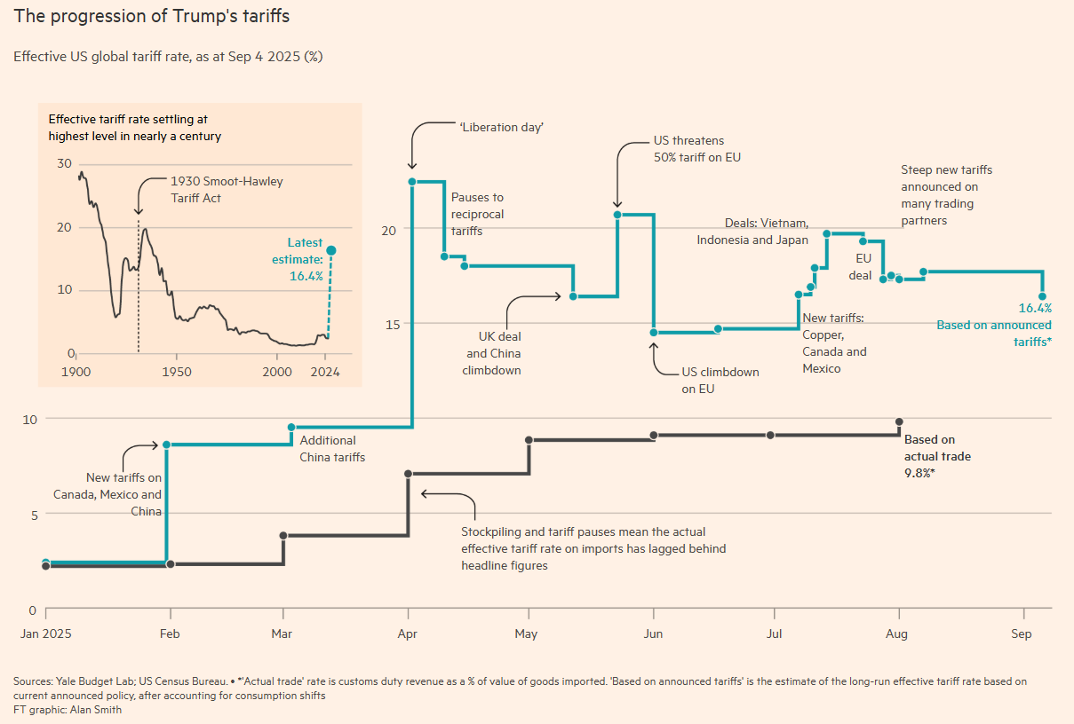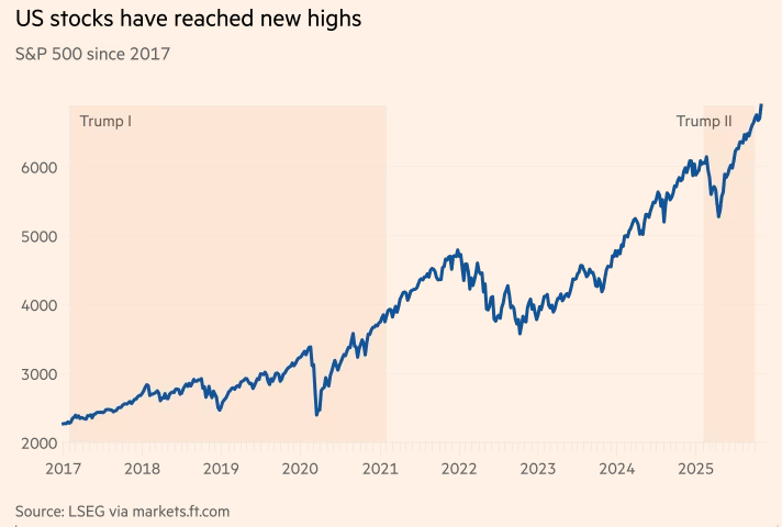 尽管经历反复,美国的实际关税税率仍升至近百年来最高水平。即便如此,受市场乐观预期推动,美国股市近月持续走高。标普500指数10月创下历史新高,收复了4月“解放日”(特朗普宣布加征关税)后引发的深度回调。