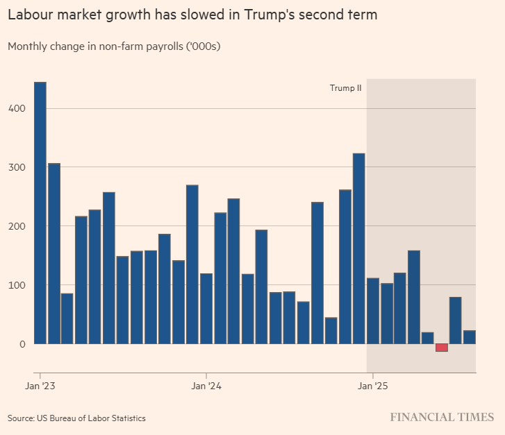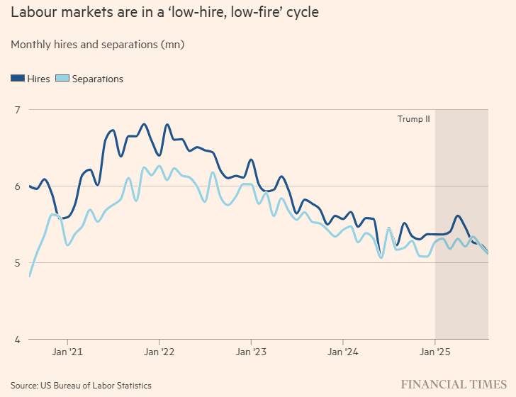 “我们正处于一个‘低招低裁’的经济阶段,”美联储主席鲍威尔9月表示,“企业在政策与前景不确定的情况下,倾向于先观望形势如何演变。”
