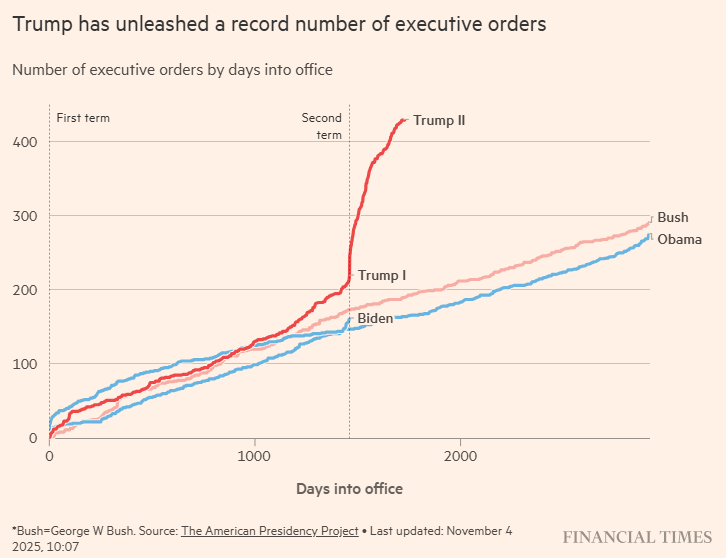 行政权力集中化特朗普通过行政令绕过国会推行政策,迄今已签署逾400项行政命令,数量超过近几十年来任何一位总统(包括他本人第一任期)。