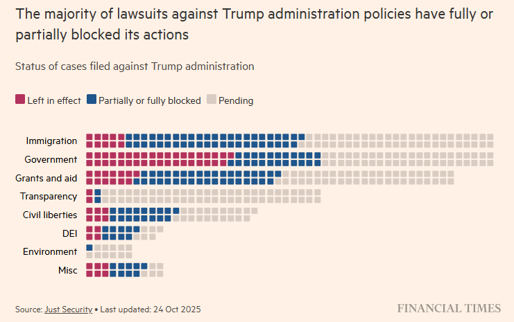 目前,美国各地法院正对这些行政令的合法性展开裁决,涉及从总统权力界限到公民权等议题。虽然约半数案件已被部分或全部驳回,但仍有逾200起诉讼等待最终裁决。