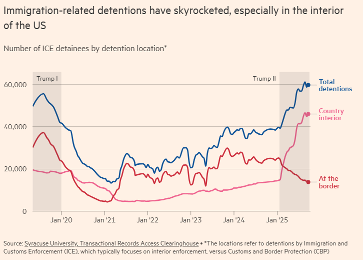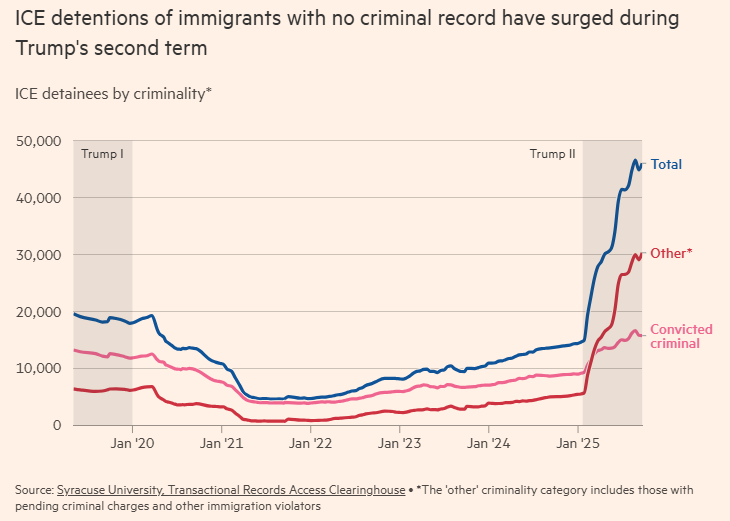 最具争议的是,被捕的无犯罪记录移民人数显著上升——ICE特工在工厂、商场停车场、甚至法院内拘捕无证移民。
