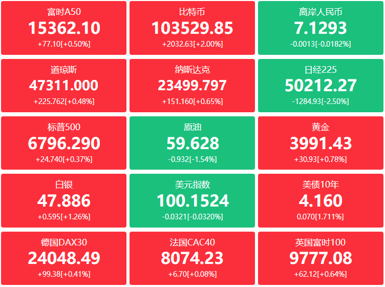 外盘:特朗普关税遭质疑且AI交易复苏,美股集体收涨,其中道指涨225.86点,涨幅0.48%报47311.10点;纳指涨151.16点,涨幅0.65%报23499.80点;标普500涨24.74点,涨幅0.37%报6796.29点;谷歌涨超2%创历史收盘新高,特斯拉涨超4%,英特尔涨逾3%,Meta涨超1%,苹果、奈飞、亚马逊小幅上涨;微软、英伟达跌超1%。Pinterest(PINS)跌超21%创该公司美国IPO以来第二最差单日表现;中概股涨跌不一,纳斯达克中国金龙指数涨0.15%,富途控股涨超4%,唯品会、好未来涨超2%,蔚来、霸王茶姬涨超1%,再鼎医药跌超4%,新东方、小鹏汽车跌逾3%,贝壳、BOSS直聘跌超2%。