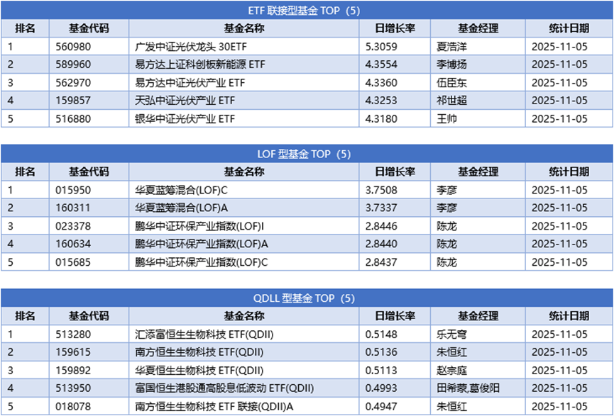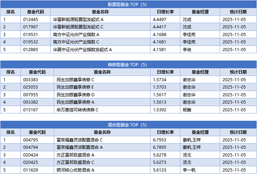 单基金方面,剔除掉 创新封基类型 基金的影响,11月05日业绩表现最好的基金为东方阿尔法科技甄选混合A,日增长率为8.3017%,其次为东方阿尔法科技甄选混合C,日增长率为8.2917%、富荣福鑫灵活配置混合C,日增长率为6.7953%。