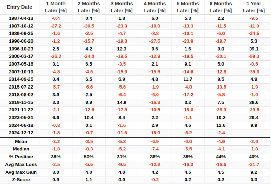 SentimenTrader指出,历史上每当这两种信号在五个交易日内合计触发五次或以上,往往预示着市场即将迎来一轮显著回调。