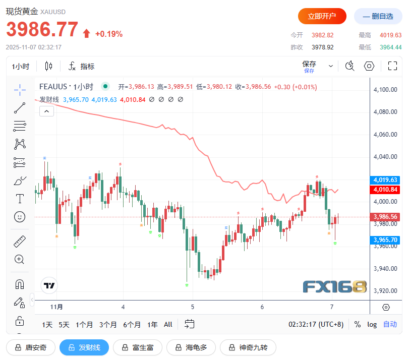 (现货黄金1小时走势图,来源:FX168)