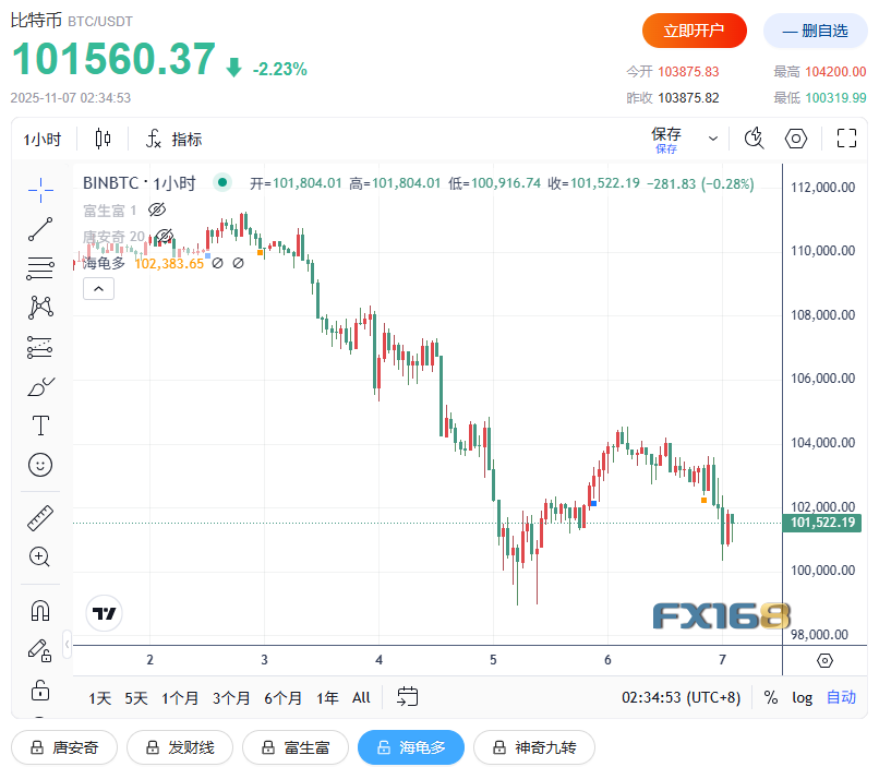 (比特币1小时走势图,来源:FX168)