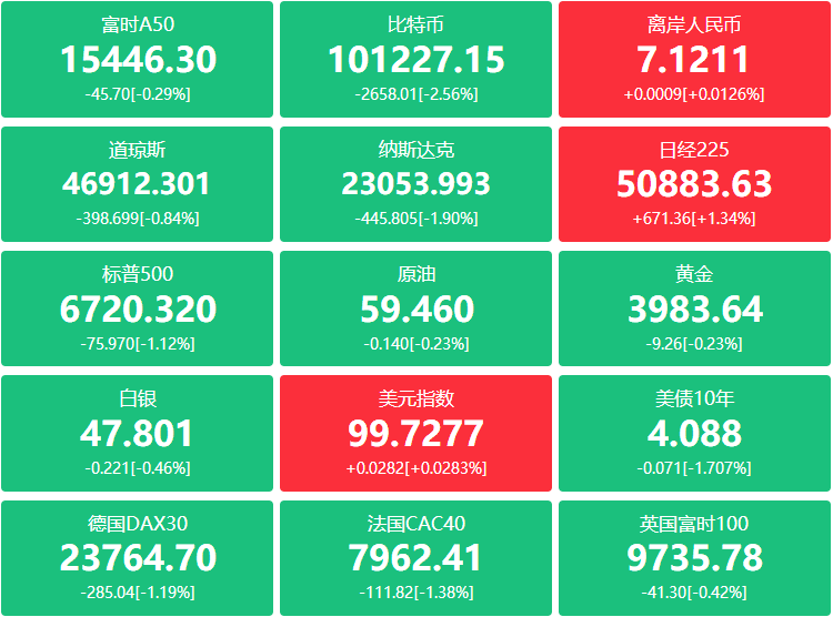 外盘:AI估值及劳动力市场状况的多重担忧令美股加速回国,三大股指集体收跌;其中道指跌398.70点,跌幅0.84%报46912.30点;纳指跌445.80点,跌幅1.90%报23053.99点,纳斯达克100指数自上周五收盘以来已跌超2%,并有望创4月初以来最差单周表现;标普500指数跌75.97点,跌幅1.12%报6720.32点;大型科技股普跌,英伟达、特斯拉跌超3%,英特尔、亚马逊、Meta跌超2%,微软跌超1%连续七个交易日下跌,创2022年以来最长连跌天数;Robinhood跌近11%,创3月以来最差单日表现。多邻国跌超25%,创该公司美国IPO以来最差单日表现;中概股涨跌不一,纳斯达克中国金龙指数跌0.03%。再鼎医药跌超6%,联电跌超5%,金山云、名创优品跌逾3%,蔚来、霸王茶姬等跌超1%,携程网、腾讯音乐等小幅下跌;小鹏汽车涨超9%,百度涨超3%,阿里巴巴、极氪涨超1%。