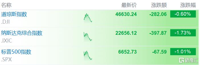 周五美股开盘,三大股指齐跌,道指现跌0.6%,标普500指数跌1.01%,纳指跌1.73%。美股七姐妹集体下挫,特斯拉盘中跌超4%,英伟达跌超3%,谷歌、meta跌超2%。