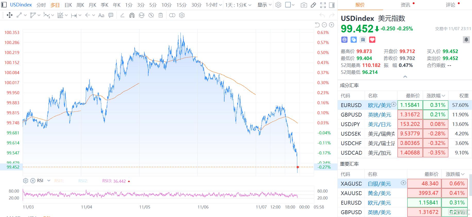 市场继续消化周四疲软的美国私营部门就业数据,美元指数跌至一周低点,现跌0.25%报99.452。